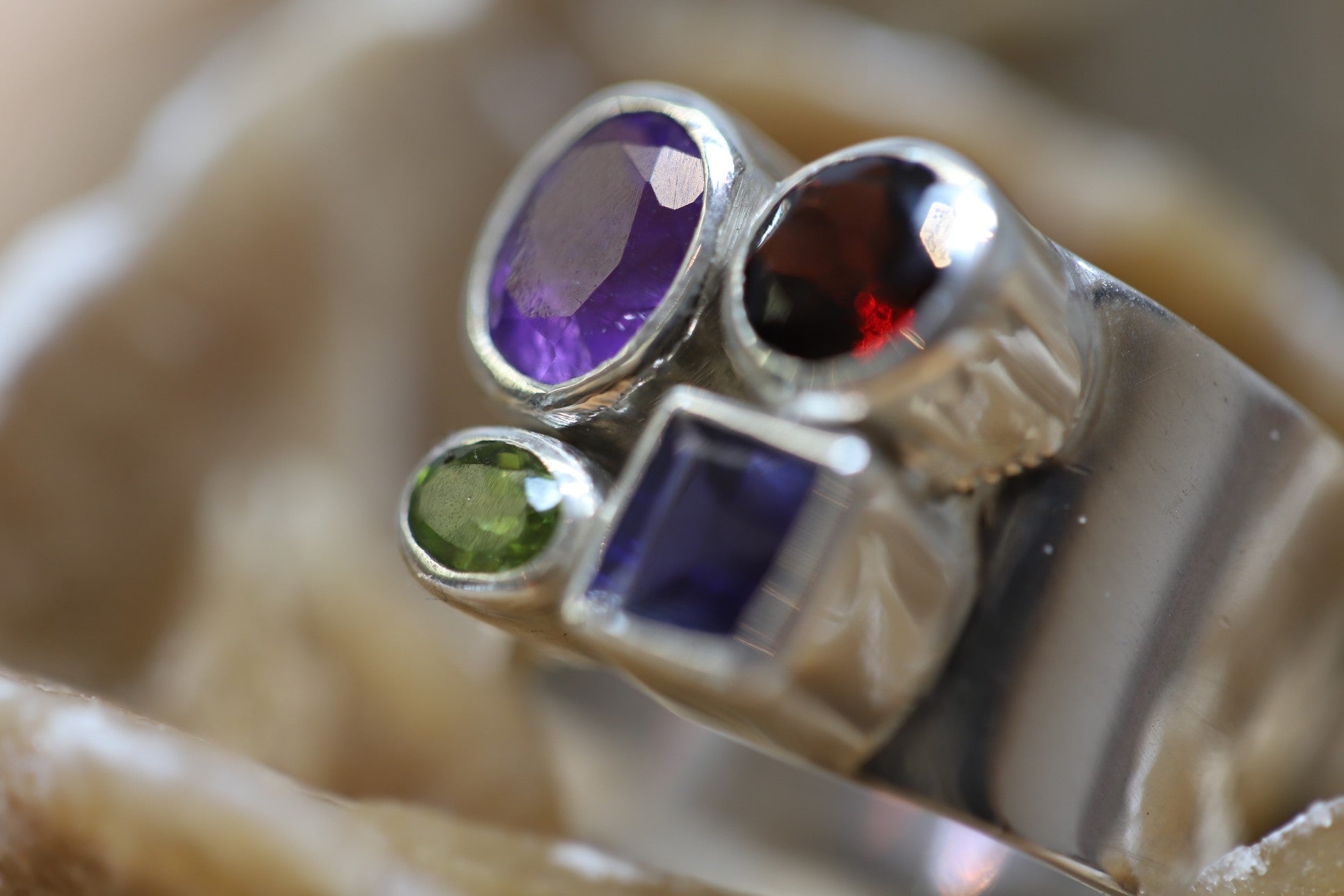 Ring aus Silber 925 mit facettierten Amethyst / Granat / Peridot und Saphir auf einer breiten Ringschiene 14 mm