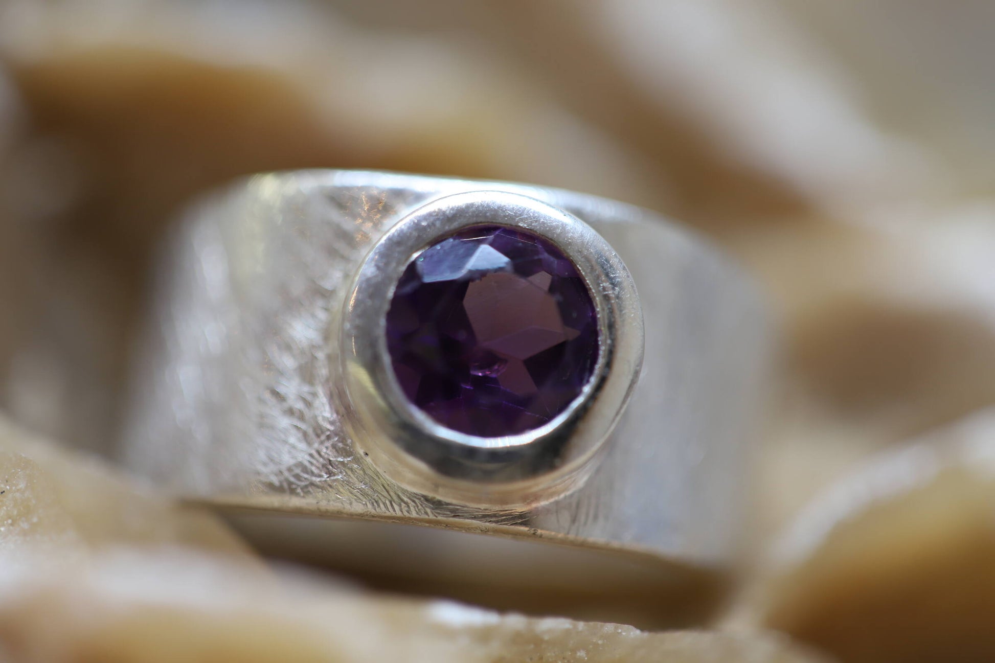 Ring aus Silber 925 satiniert mit einem facettierten und leuchtenden Amethysten 7mm