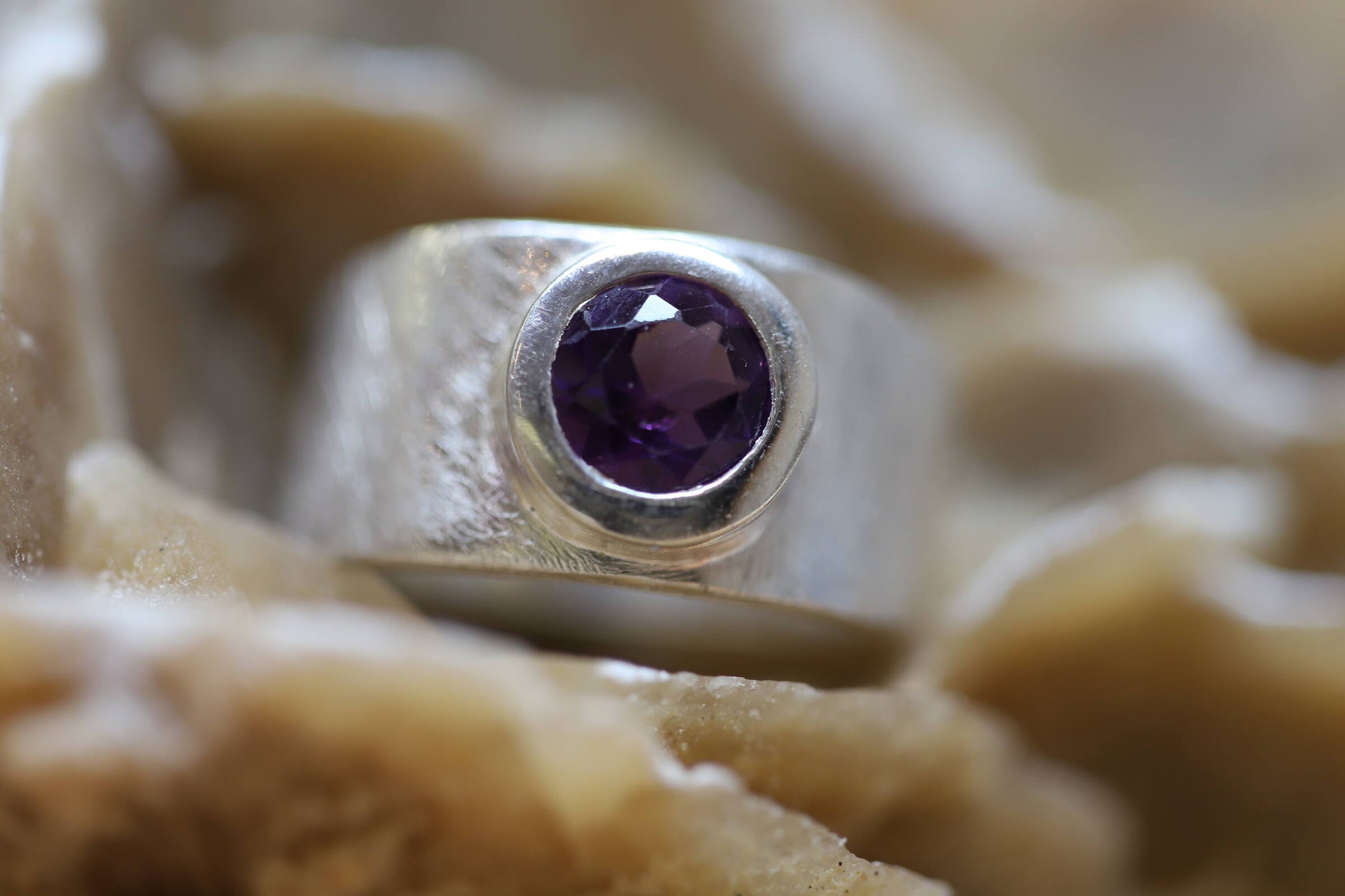 Ring aus Silber 925 satiniert mit einem facettierten und leuchtenden Amethyst